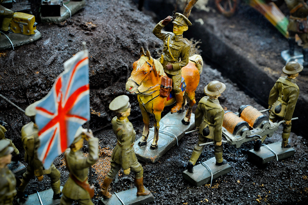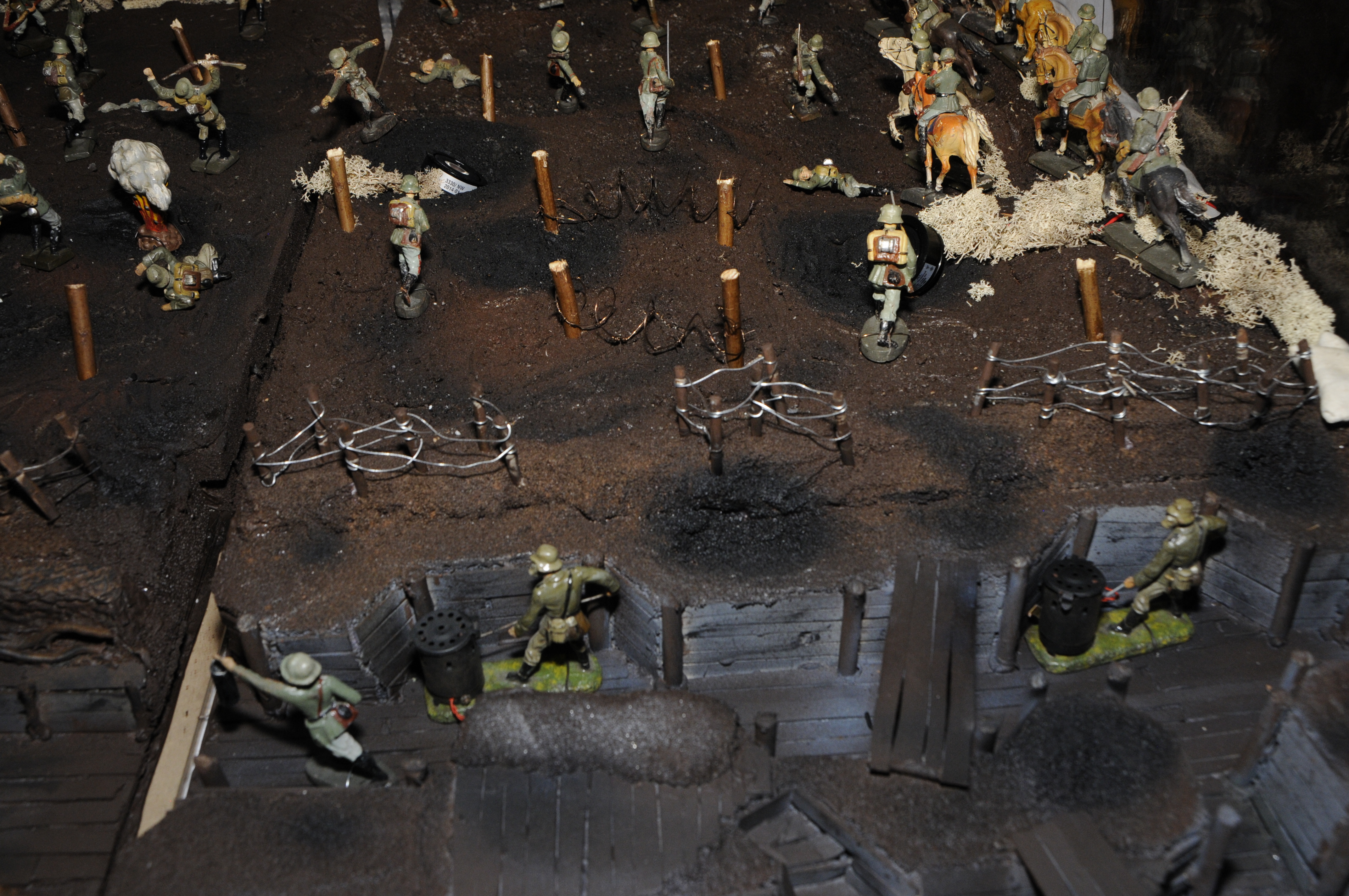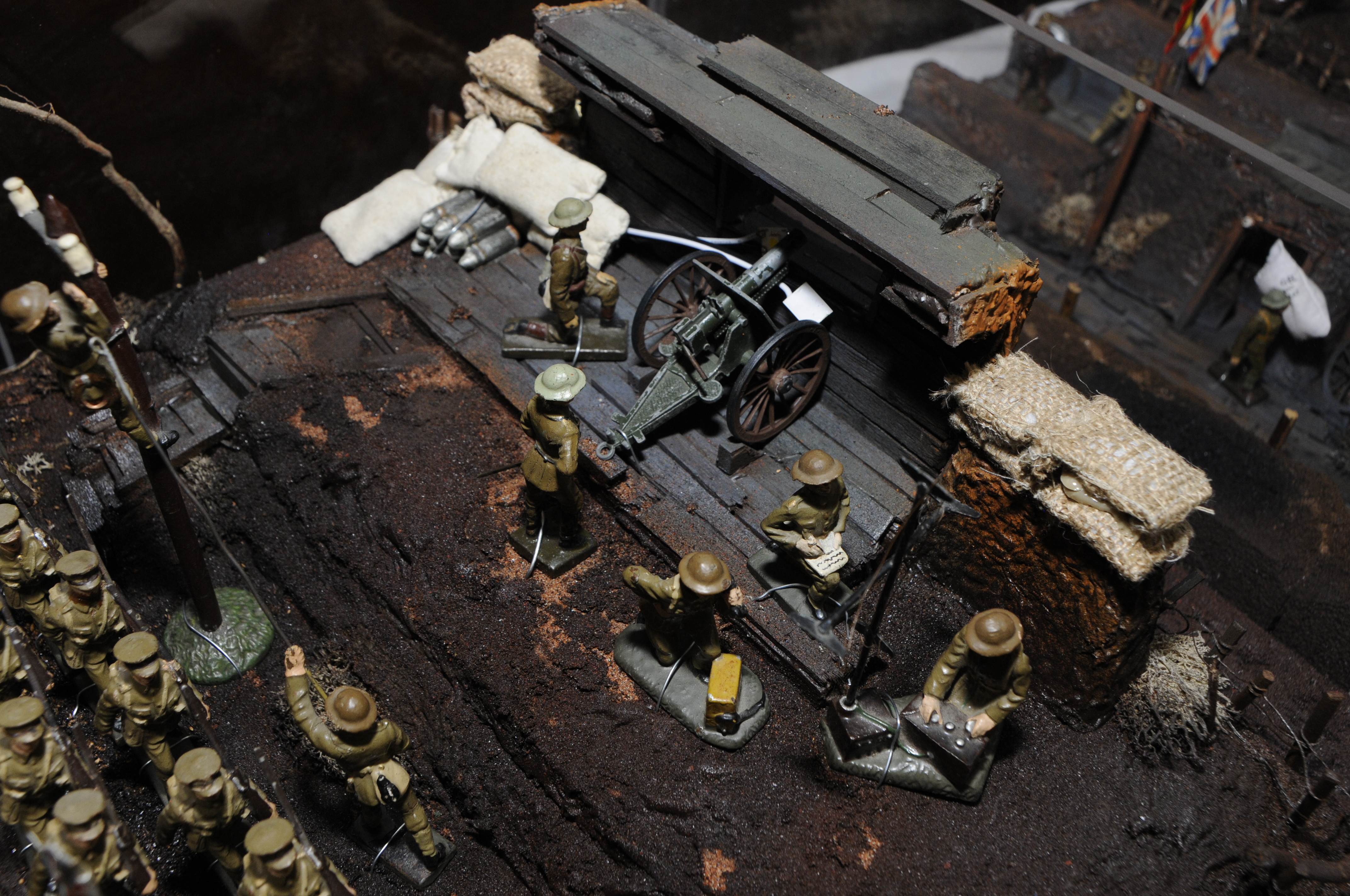 Toutes les figurines font parties de la collection de M. Daniel Renaud et près de 400 furent installées sur la maquette. On a essayé d’en placer un maximum sur la maquette pour les mettre en valeur, à cet effet, et sachant très bien que les porte- drapeaux et la cavalerie étaient plus en arrière, nous les avons placés pour mieux les mettre en évidence. Les tranchées britanniques et françaises étaient plus boueuses à l’époque, mais, pour faire ressortir le plus possible les figurines et leur équipement, elles furent fabriquées en planches, facilitant ainsi l’installation des figurines ayant dû placer des broches sous leurs socles pour ne pas les endommager.