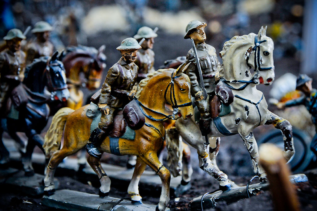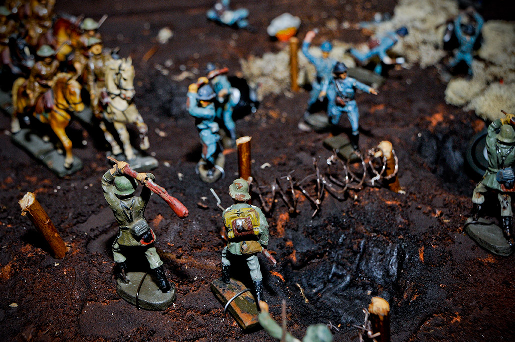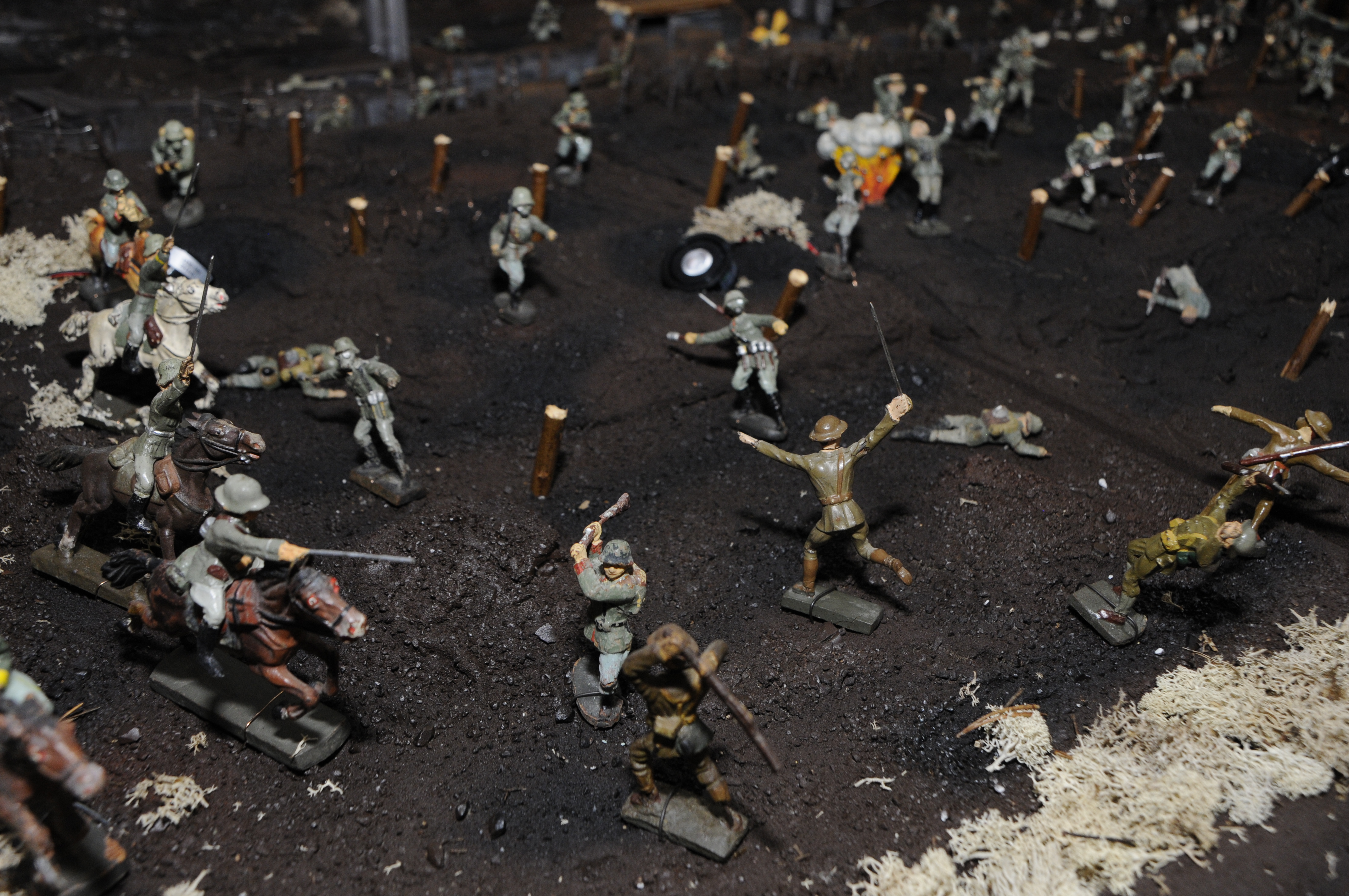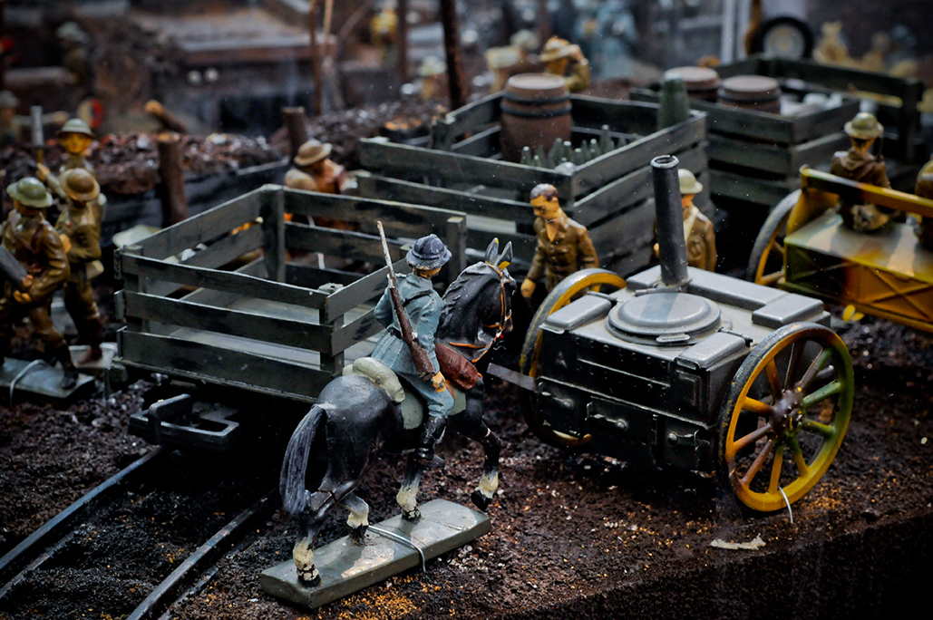 Toutes les figurines font parties de la collection de M. Daniel Renaud et près de 400 furent installées sur la maquette. On a essayé d’en placer un maximum sur la maquette pour les mettre en valeur, à cet effet, et sachant très bien que les porte- drapeaux et la cavalerie étaient plus en arrière, nous les avons placés pour mieux les mettre en évidence. Les tranchées britanniques et françaises étaient plus boueuses à l’époque, mais, pour faire ressortir le plus possible les figurines et leur équipement, elles furent fabriquées en planches, facilitant ainsi l’installation des figurines ayant dû placer des broches sous leurs socles pour ne pas les endommager.