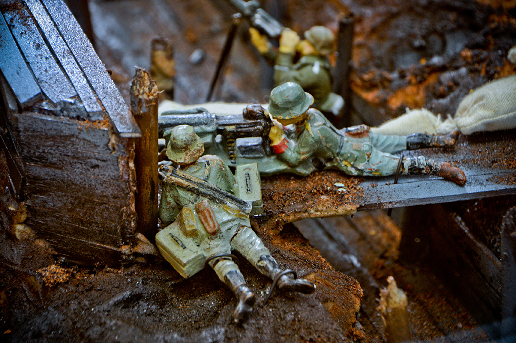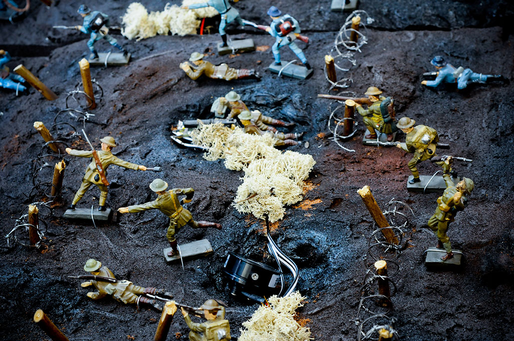 Je me suis servi de vidéos sur You tube, de films d’archives, de photographies et de documentaires sur le sujet pour mieux comprendre les conditions de vie dans les tranchées. Les tranchées sont composées de styromousse et de vrai bois posé planche par planche. Le fond du terrain a été recouvert de colle, gravier, sable et autre produits de Diorama.